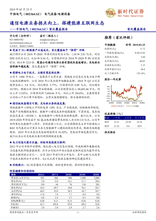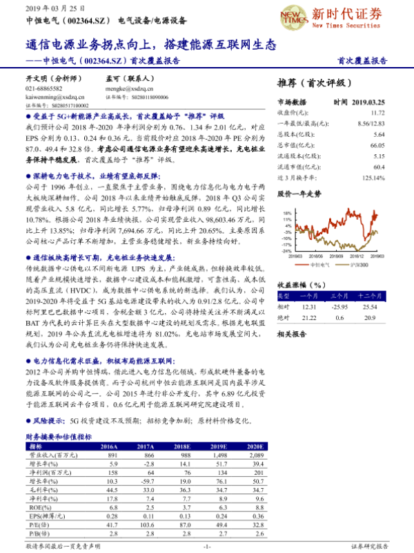 【新时代证券】【20190325】20190325-新时代证券-中恒电气-002364.SZ-首次覆盖报告:通信电源业务拐点向上,搭建能源互联网生态-30页