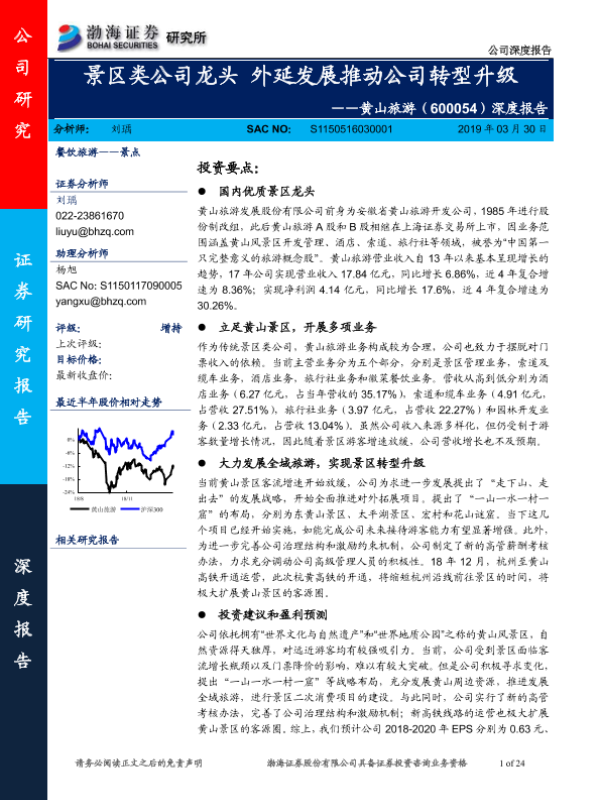 【渤海证券】【20190330】20190330-渤海证券-黄山旅游-600054.SH-深度报告:景区类公司龙头 外延发展推动公司转型升级-24页
