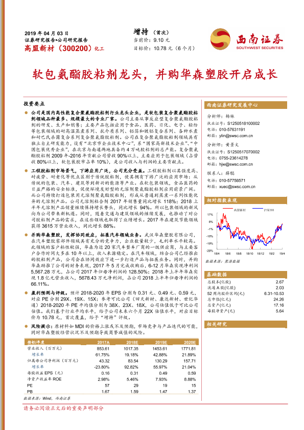 【西南证券】【20190403】高盟新材-300200.SZ-软包氨酯胶粘剂龙头,并购华森塑胶开启成长-23页