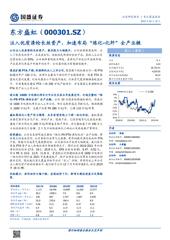 【国盛证券】【20190410】注入优质涤纶长丝资产,加速布局“炼化-化纤”全产业链-30页