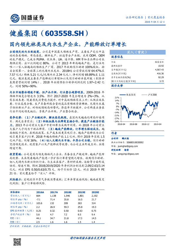 【国盛证券】【20190412】健盛集团-国内领先袜类及内衣生产企业,产能释放订单增长-22页