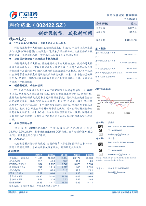 创新转型 医药行业 研发管线 科伦药业 财务预测