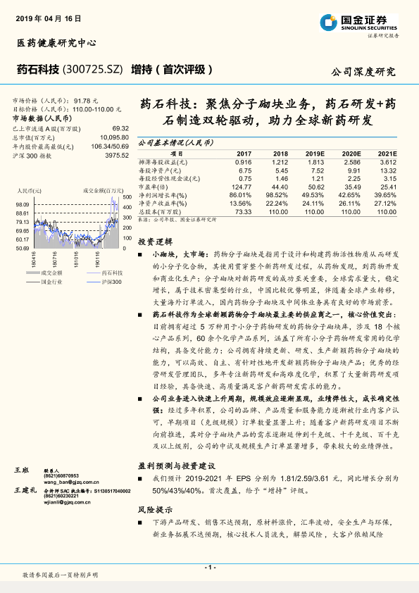 【国金证券】【20190416】药石科技:聚焦分子砌块业务,药石研发+药石制造双轮驱动,助力全球新药研发-22页