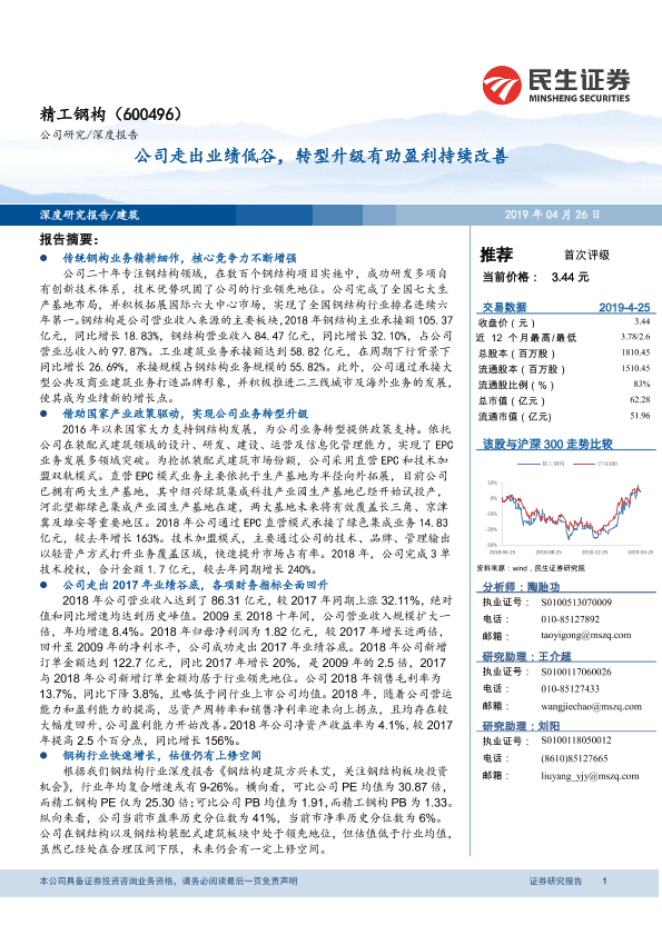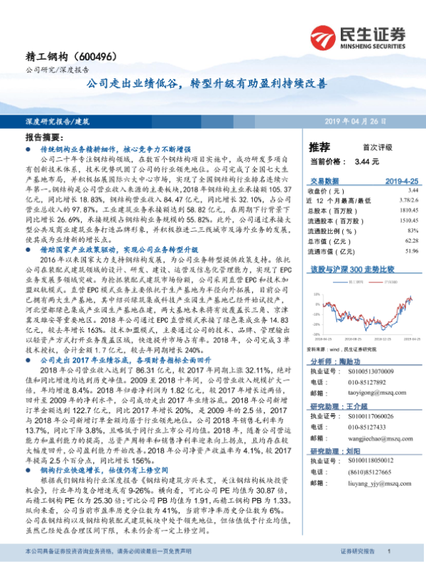 【民生证券】【20190426】精工钢构(600496)公司走出业绩低谷,转型升级有助盈利持续改善-17页