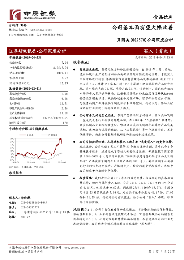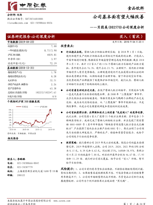 【中原证券】【20190423】20190423-中原证券-贝因美-002570.SZ-公司深度分析:公司基本面有望大幅改善-20页