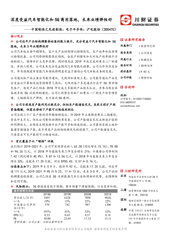 【川财证券】【20190509】中国制造之先进制造:电子半导体:沪电股份:深度受益汽车智能化和5G商用落地,未来业绩弹性好-26页