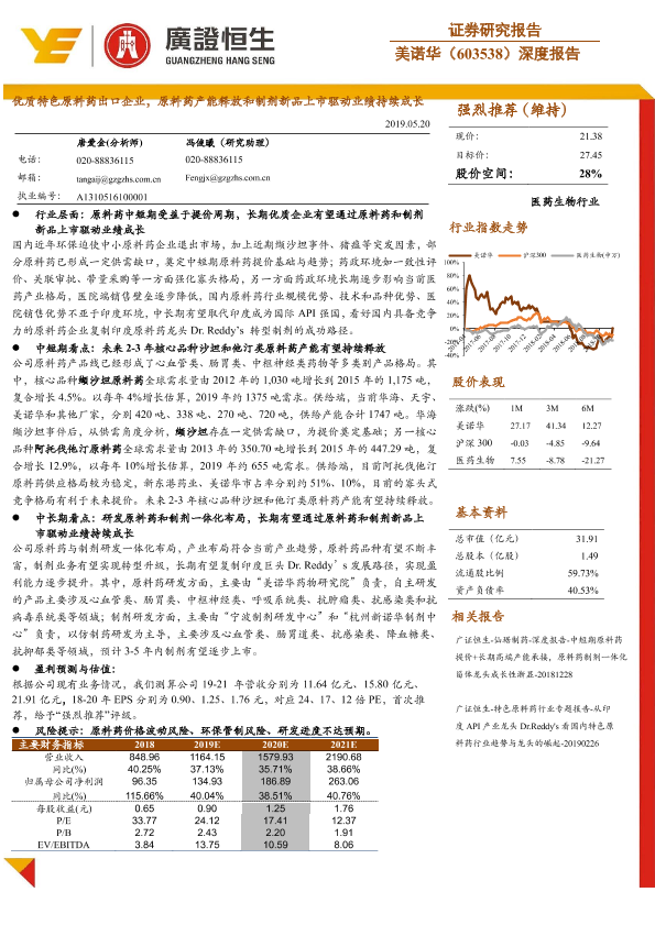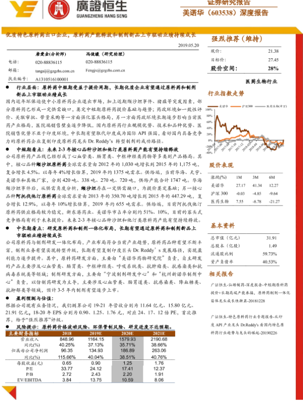【广证恒生】【20190520】美诺华-603538.SH-深度报告:优质特色原料药出口企业,原料药产能释放和制剂新品上市驱动业绩持续成长-21页