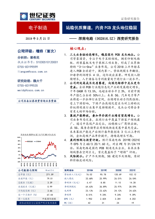 【世纪证券】【20190521】深南电路-002916.SZ-深度研究报告:站稳优质赛道,内资PCB龙头地位稳固-24页