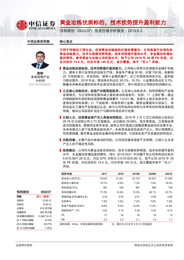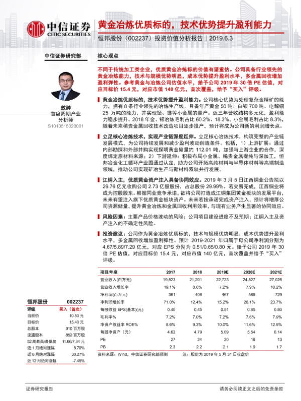 【中信证券】【20190603】20190603-中信证券-恒邦股份-002237.SZ-投资价值分析报告:黄金冶炼优质标的,技术优势提升盈利能力-23页