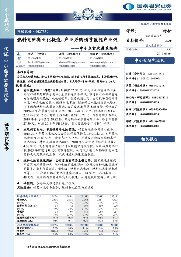 【国泰君安证券】【20190604】雄韬股份-002733.SZ-中小盘首次覆盖报告:燃料电池商业化提速,产业并购横贯氢能产业链-32页