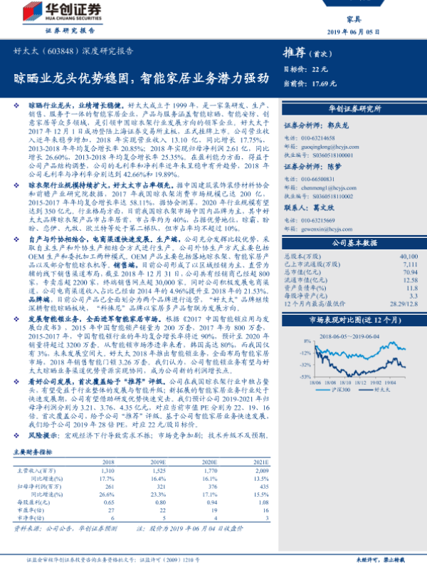 【华创证券】【20190605】20190605-华创证券-好太太-603848.SH-深度研究报告:晾晒业龙头优势稳固,智能家居业务潜力强劲-18页