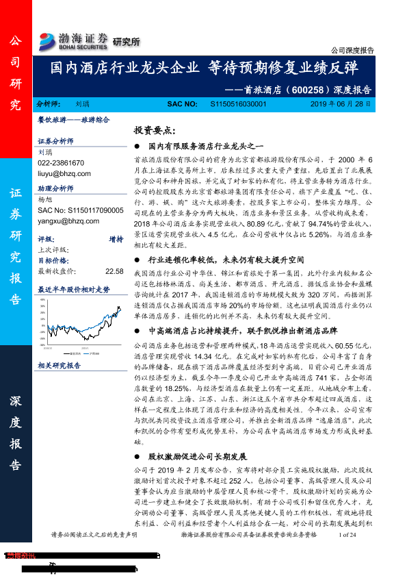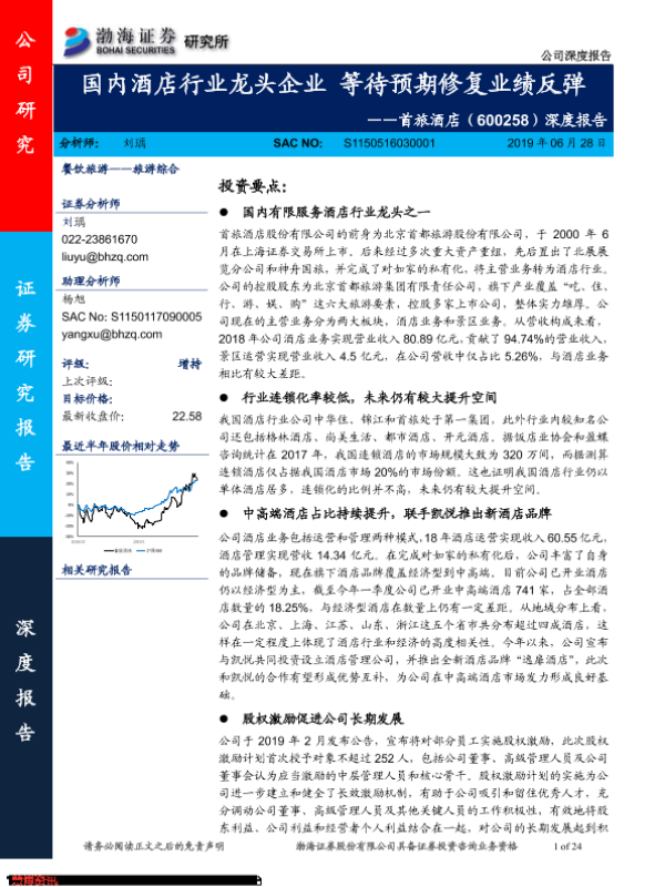 【渤海证券】【20190628】20190628-渤海证券-首旅酒店-600258.SH-深度报告:国内酒店行业龙头企业 等待预期修复业绩反弹-24页