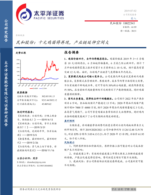 【太平洋证券】【20190702】民和股份:十元鸡苗将再现,产业链延伸空间大-13页