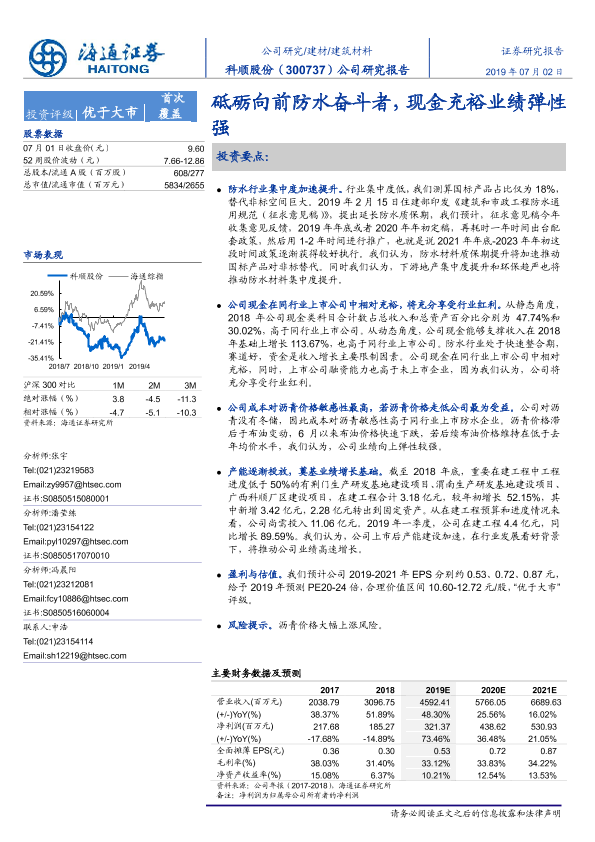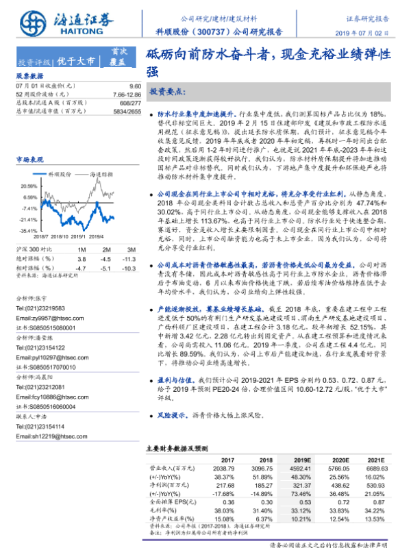 【海通证券】【20190702】科顺股份-300737.SZ-公司研究报告:砥砺向前防水奋斗者,现金充裕业绩弹性强-22页