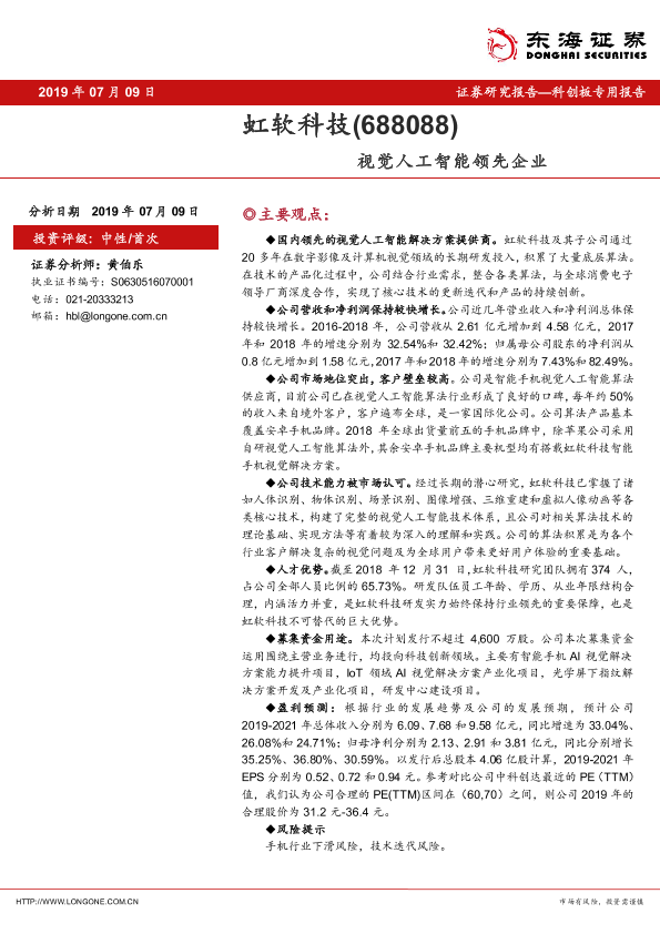 【东海证券】【20190709】2019年07月09日证券研究报告—科创板专用报告:虹软科技(688088)视觉人工智能领先企业-24页
