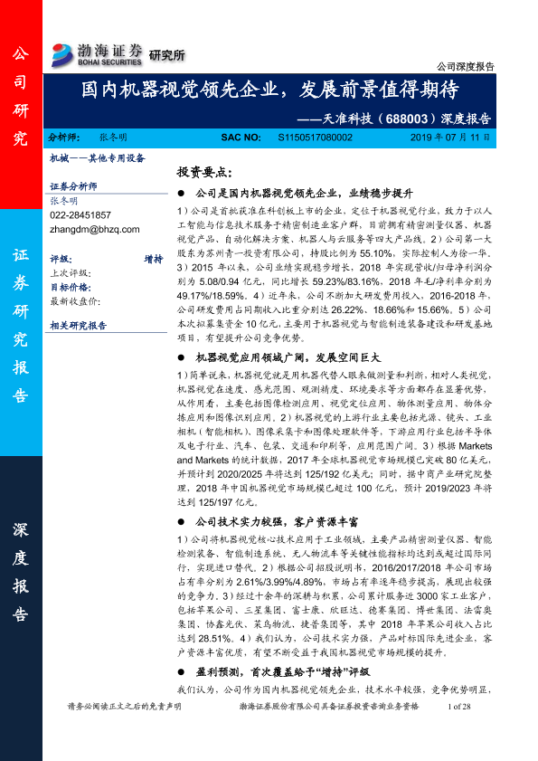 【渤海证券】【20190711】20190711-渤海证券-天准科技-688003.SH-深度报告:国内机器视觉领先企业,发展前景值得期待-28页
