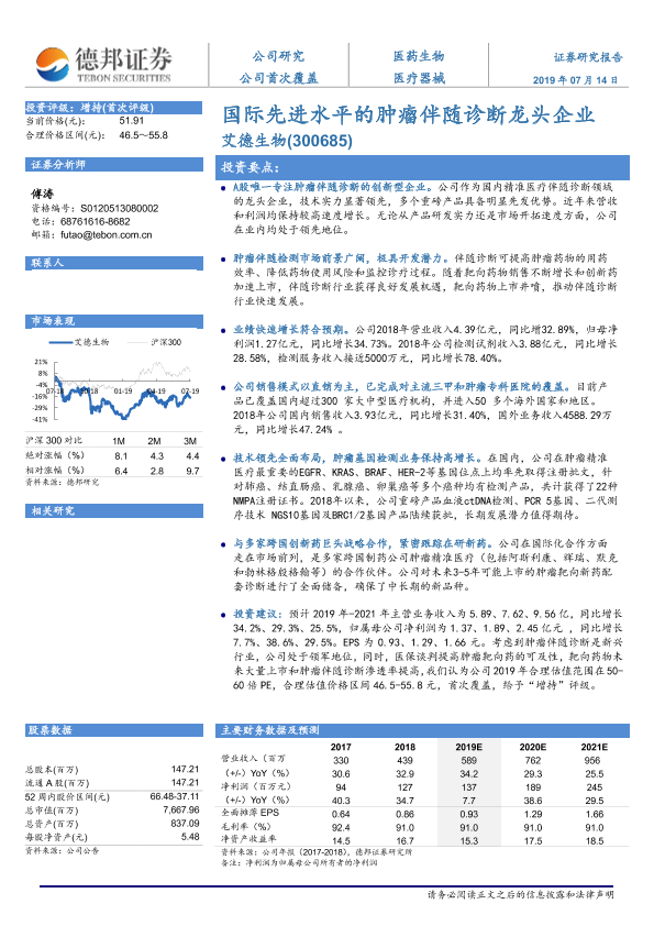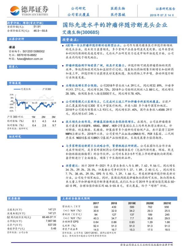 【德邦证券】【20190714】20190714-德邦证券-艾德生物-300685.SZ-国际先进水平的肿瘤伴随诊断龙头企业-30页