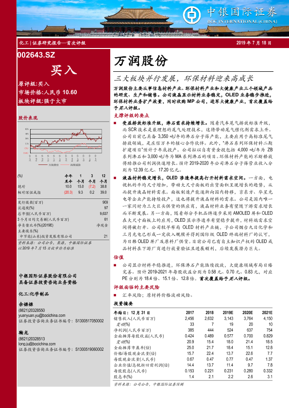 【中银证券】【20190718】20190718-中银证券-万润股份-002643.SZ-三大板块并行发展,环保材料迎来高成长-32页