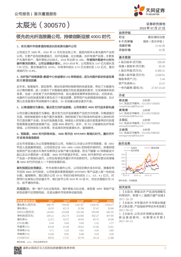 【天风证券】【20190727】太辰光-300570.SZ-领先的光纤连接器公司,持续创新迎接400G时代-25页