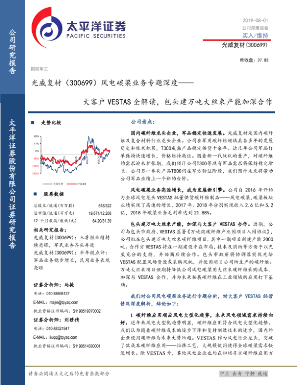 【太平洋证券】【20190801】光威复材(300699)风电碳梁业务专题深度——大客户 VESTAS全解读,包头建万吨大丝束产能加深合作-36页