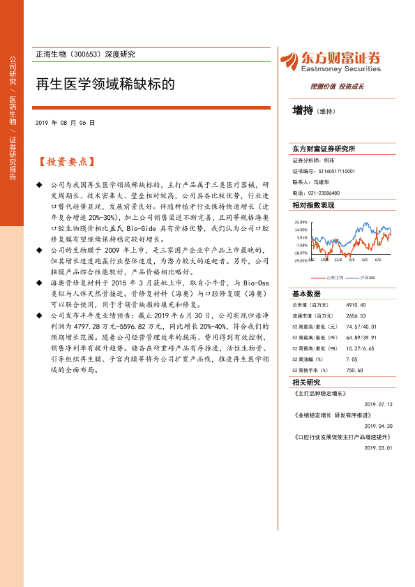 【东方财富证券】【20190806】正海生物-300653.SZ-深度研究:再生医学领域稀缺标的-27页