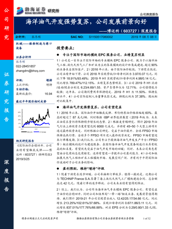 【渤海证券】【20190808】20190808-渤海证券-博迈科-603727.SH-深度报告:海洋油气开发强势复苏,公司发展前景向好-32页