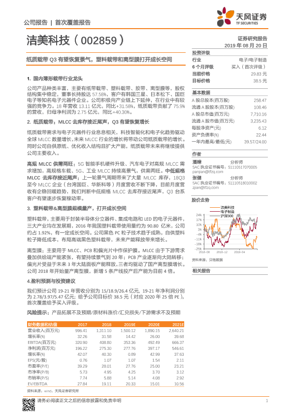 【天风证券】【20190820】洁美科技-002859.SZ-纸质载带Q3有望恢复景气,塑料载带和离型膜打开成长空间-24页