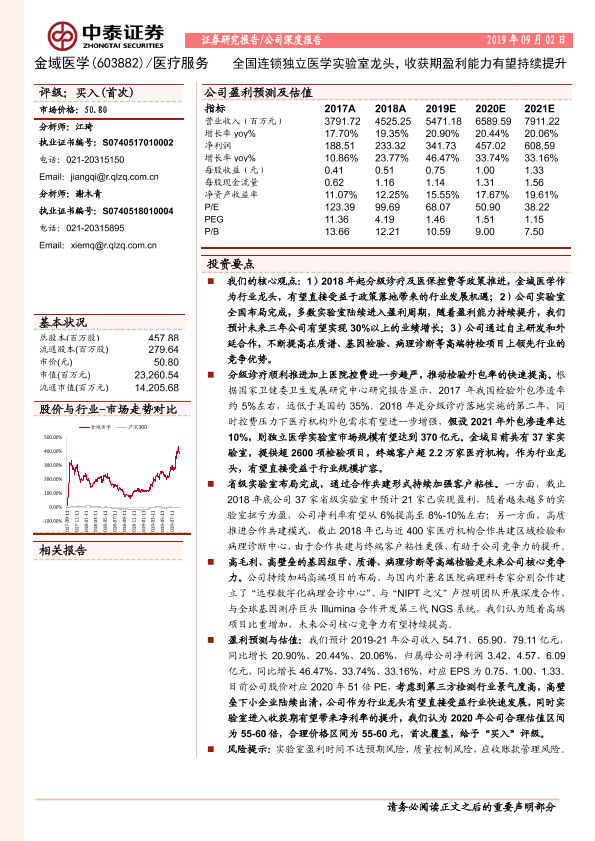 【中泰证券】【20190902】中泰证券-金域医学-603882.SH-全国连锁独立医学实验室龙头,收获期盈利能力有望持续提升-21页
