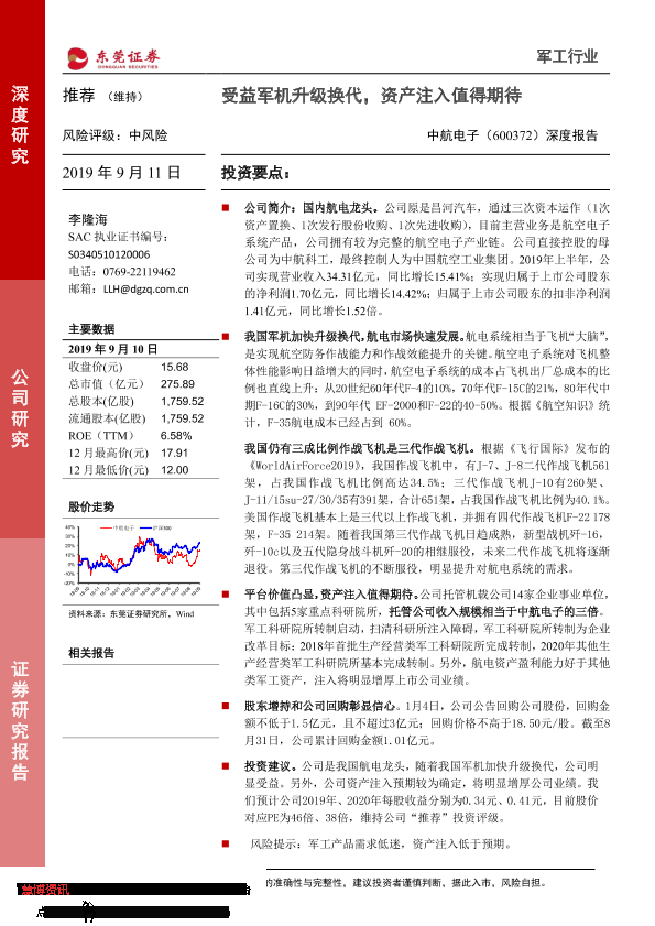 【东莞证券】【20190911】20190911-东莞证券-中航电子-600372.SH-深度报告:受益军机升级换代,资产注入值得期待-13页