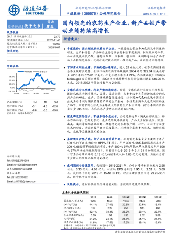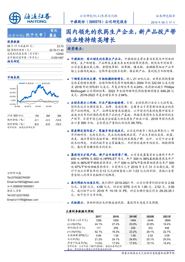 【海通证券】【20190918】中旗股份:国内领先的农药生产企业,新产品投产带动业绩持续高增长-21页