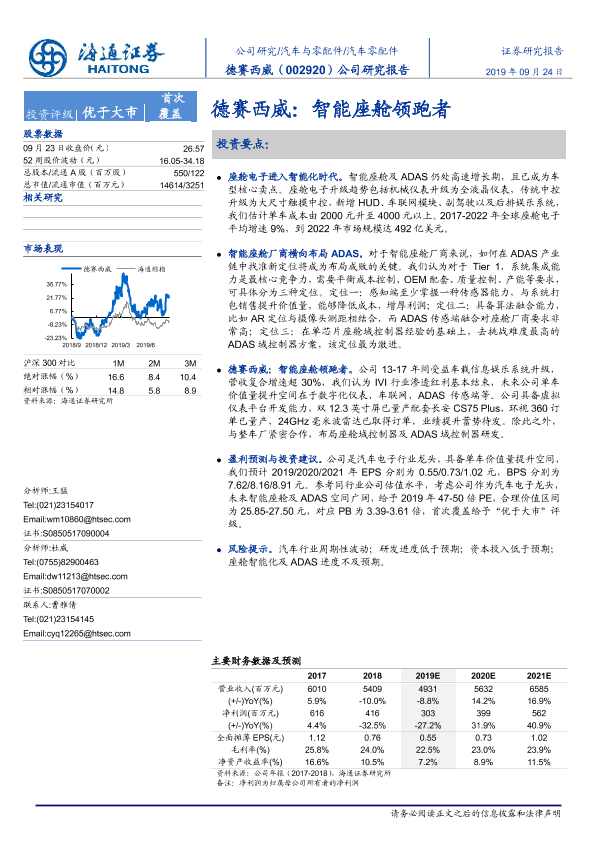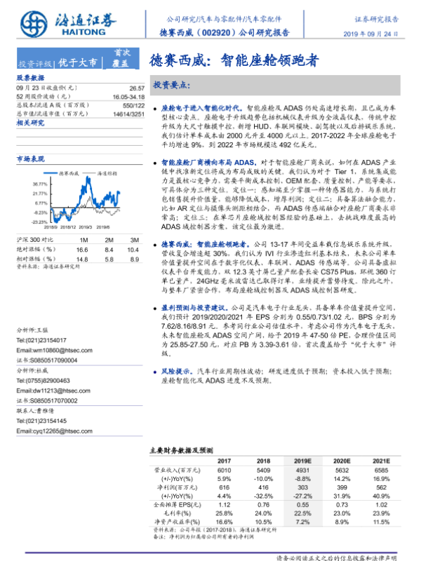 【海通证券】【20190924】德赛西威:智能座舱领跑者-27页