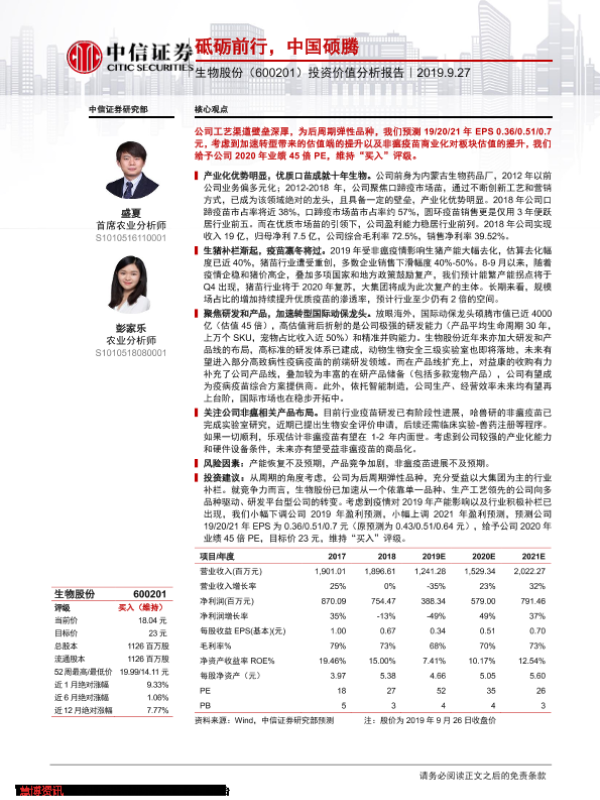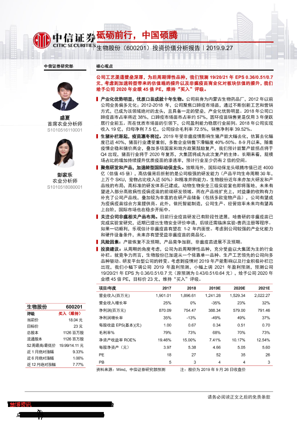 【中信证券】【20190927】砥砺前行,中国硕腾——生物股份(600201)投资价值分析报告-29页