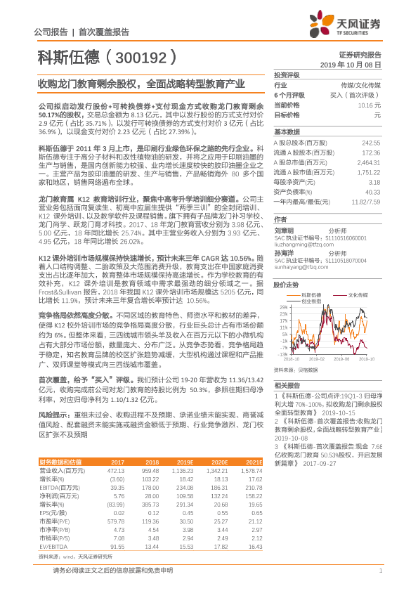 【天风证券】【20191008】科德教育-300192.SZ-收购龙门教育剩余股权,全面战略转型教育产业-22页