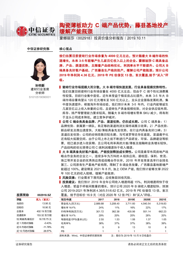 【中信证券】【20191011】蒙娜丽莎-002918.SZ-投资价值分析报告:陶瓷薄板助力C端产品优势,藤县基地投产缓解产能瓶颈-28页