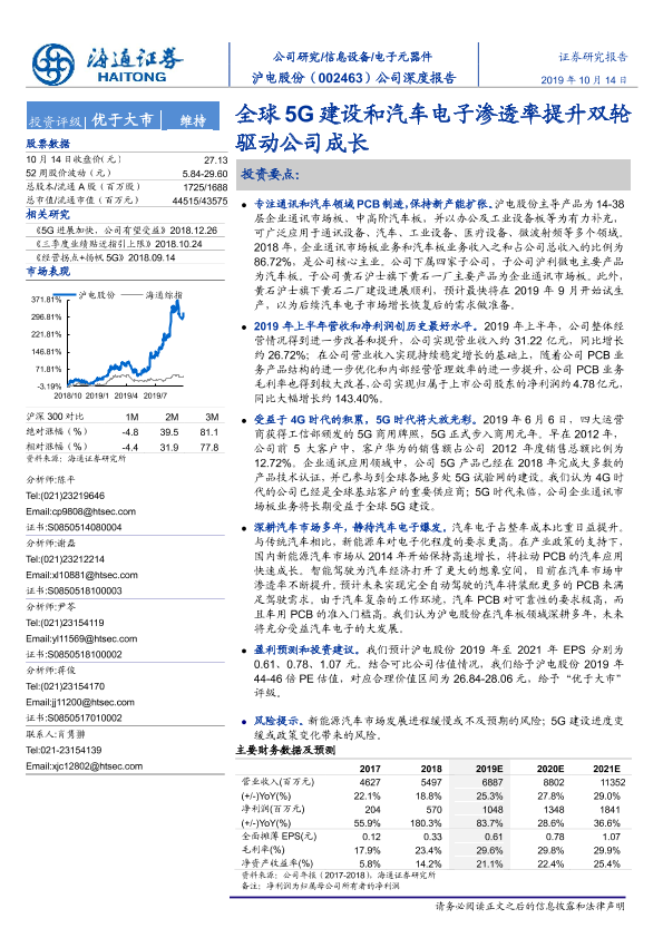 【海通证券】【20191014】20191014-海通证券-沪电股份-002463.SZ-公司深度报告:全球5G建设和汽车电子渗透率提升双轮驱动公司成长-22页