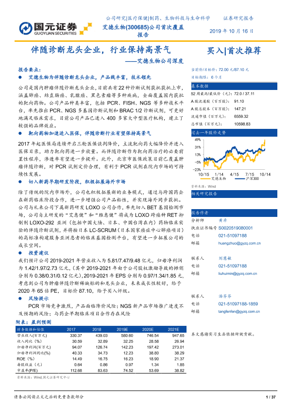【国元证券】【20191016】艾德生物公司深度:伴随诊断龙头企业,行业保持高景气-37页