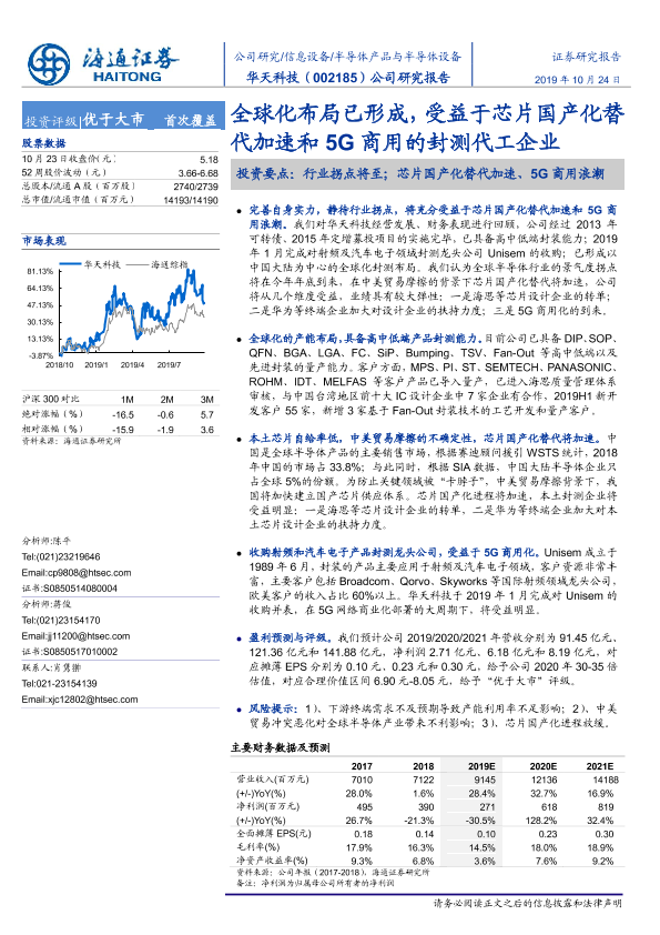 【海通证券】【20191024】华天科技-002185.SZ-公司研究报告:全球化布局已形成,受益于芯片国产化替代加速和5G商用的封测代工企业-28页
