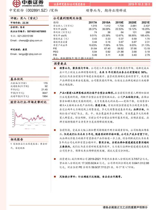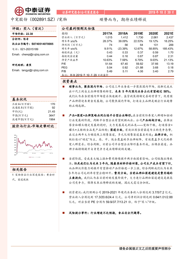 【中泰证券】【20191030】20191030-中泰证券-中宠股份-002891.SZ-顺势而为,期待业绩释放-23页