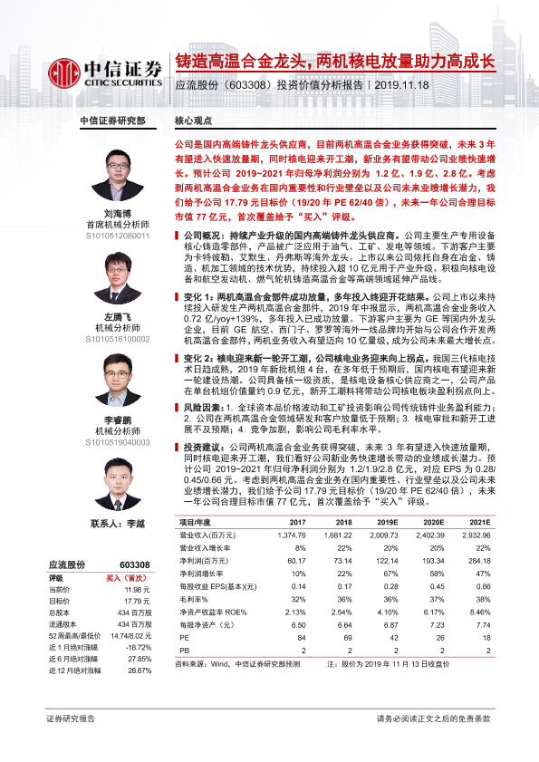 【中信证券】【20191118】20191118-中信证券-应流股份-603308.SH-投资价值分析报告:铸造高温合金龙头,两机核电放量助力高成长-39页