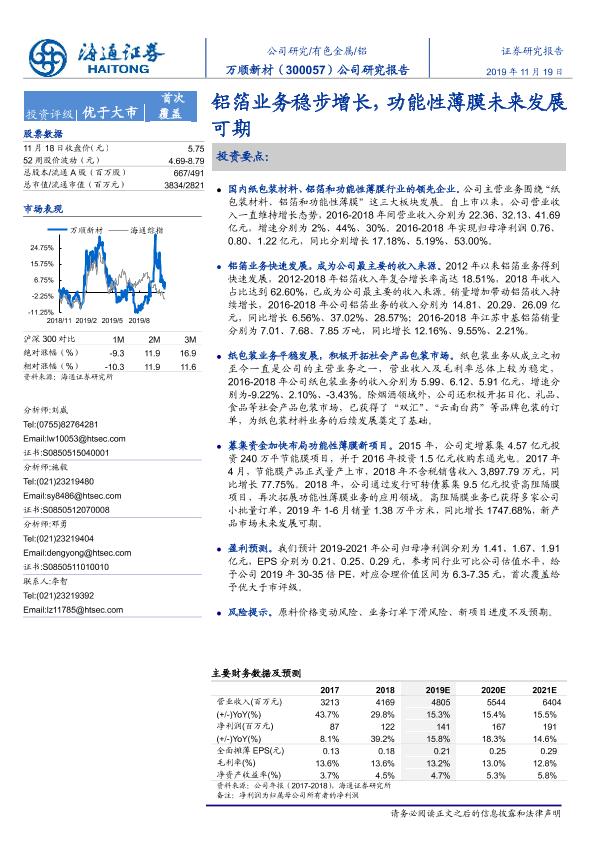 【海通证券】【20191119】万顺新材-300057.SZ-公司研究报告:铝箔业务稳步增长,功能性薄膜未来发展可期-21页