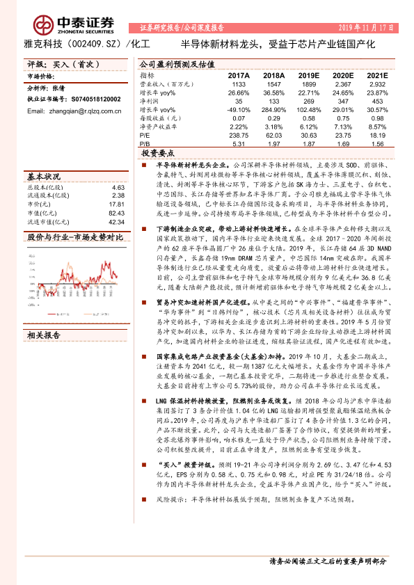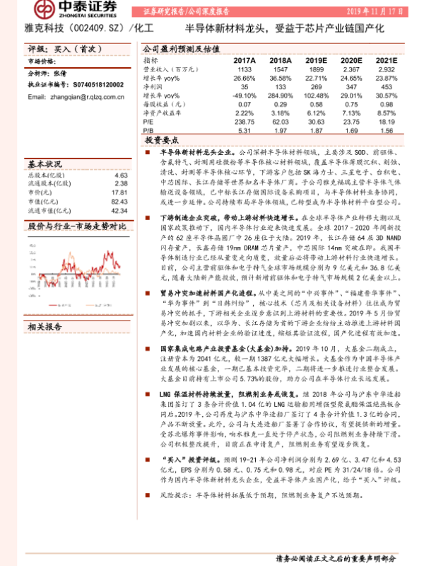 【中泰证券】【20191117】20191117-中泰证券-雅克科技-002409.SZ-半导体新材料龙头,受益于芯片产业链国产化-31页