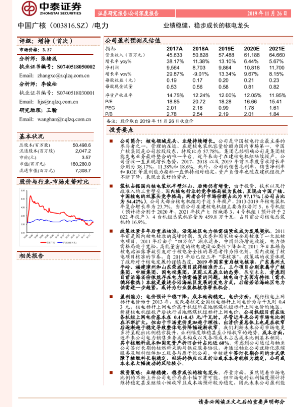 【中泰证券】【20191126】中国广核-003816.SZ-业绩稳健、稳步成长的核电龙头-20页