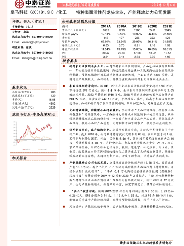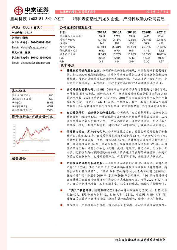 【中泰证券】【20191206】20191206-中泰证券-皇马科技-603181.SH-特种表面活性剂龙头企业,产能释放助力公司发展-24页