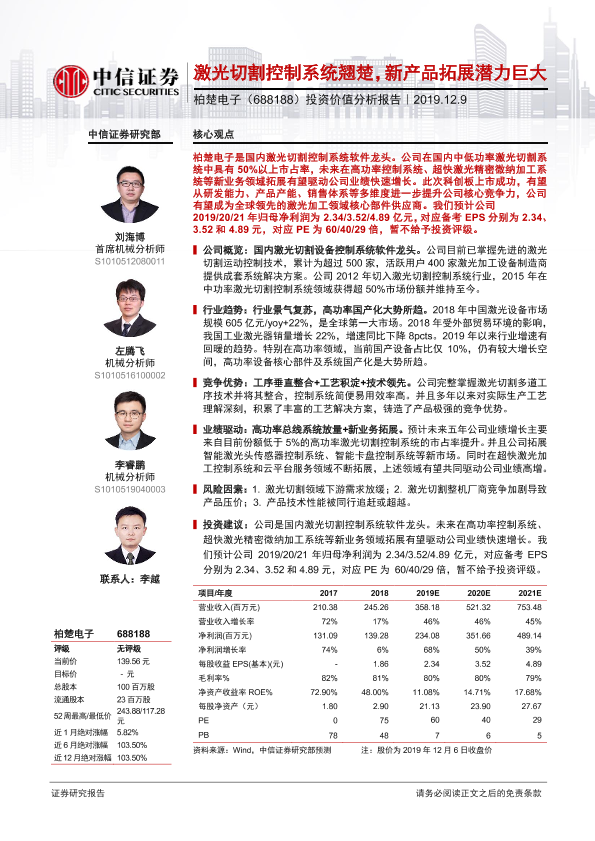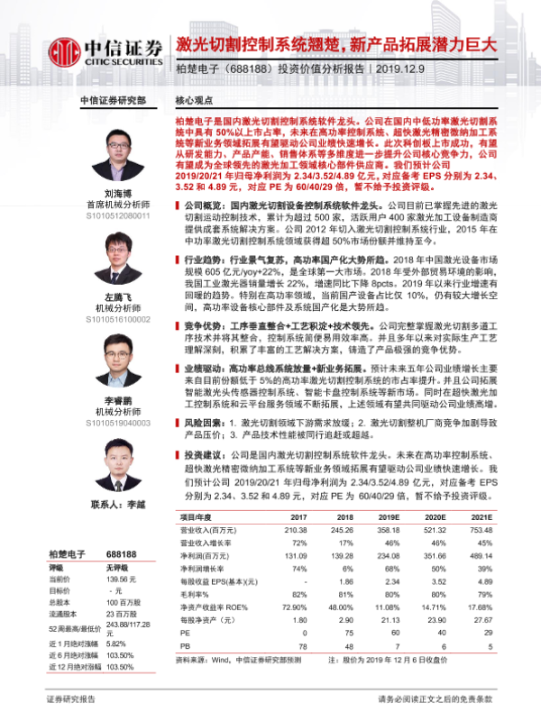 投资价值 控制系统 柏楚电子 激光切割 科创板