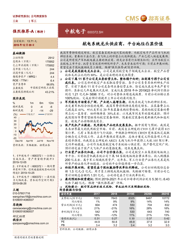 【海通证券】【20191209】中航电子-600372.SH-航电系统龙头供应商,平台地位凸显价值-42页