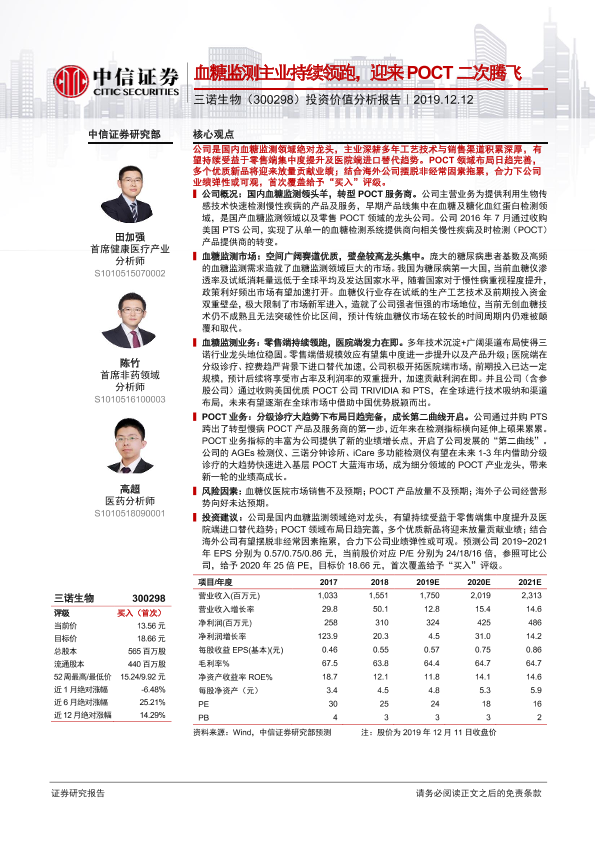 【中信证券】【20191212】20191212-中信证券-三诺生物-300298.SZ-投资价值分析报告:血糖监测主业持续领跑,迎来POCT二次腾飞-30页