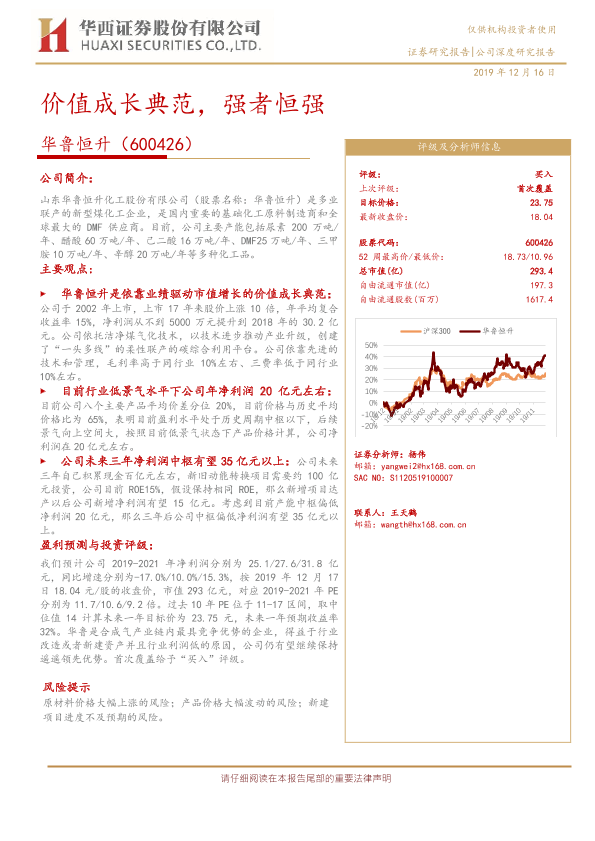 价值成长 化工行业 华鲁恒升 煤化工 财务预测