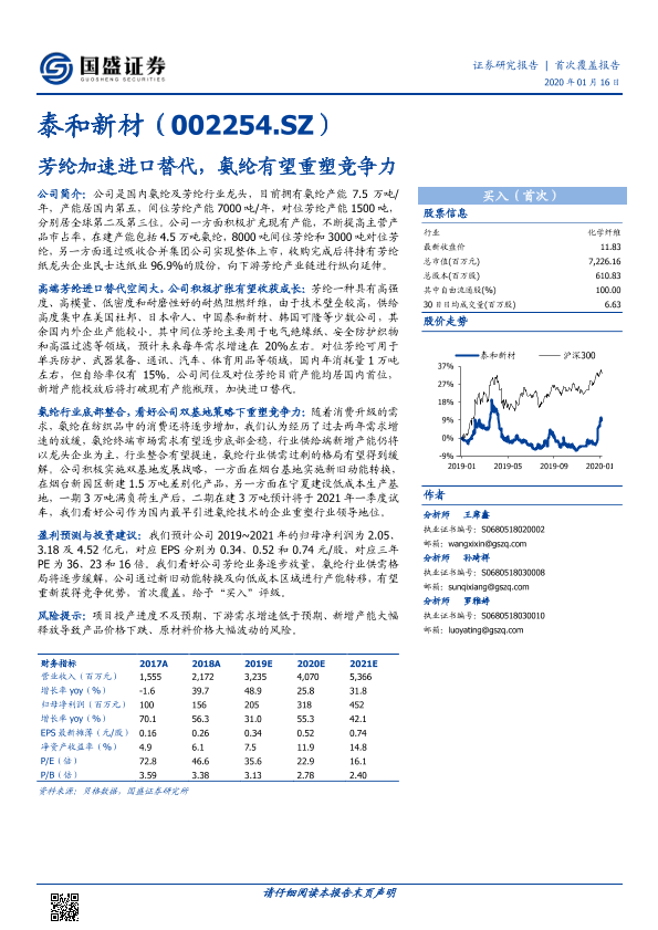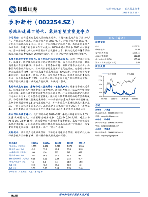 【国盛证券】【20200116】泰和新材-芳纶加速进口替代,氨纶有望重塑竞争力-22页