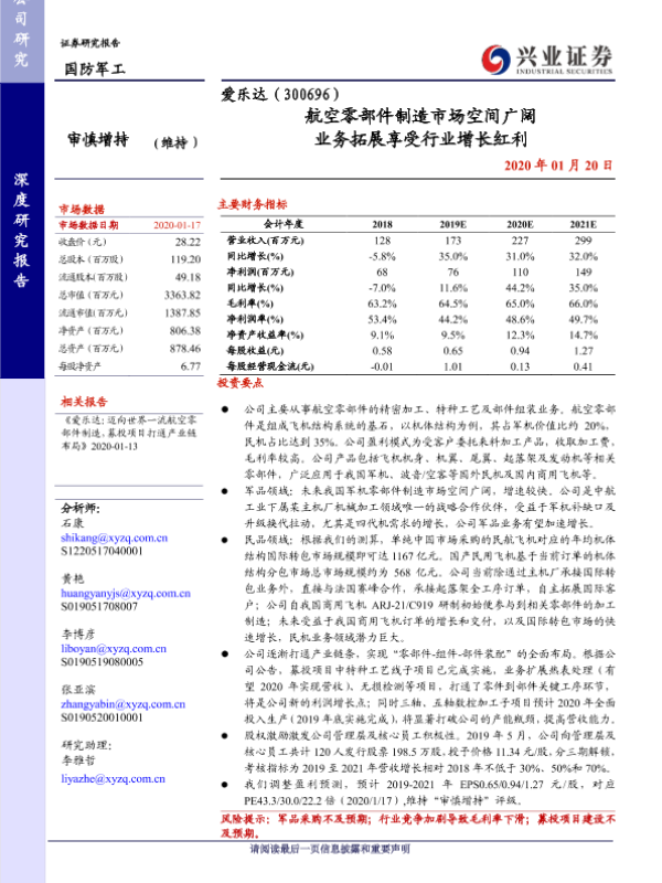 【兴业证券】【20200120】爱乐达(300696)航空零部件制造市场空间广阔 业务拓展享受行业增长红利-26页
