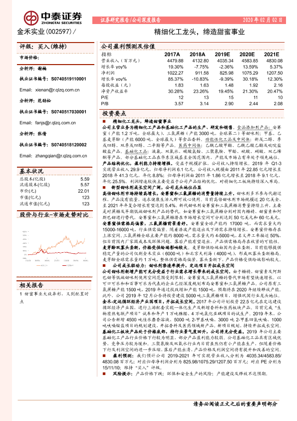 【中泰证券】【20200202】20200202-中泰证券-金禾实业-002597.SZ-精细化工龙头,缔造甜蜜事业-40页